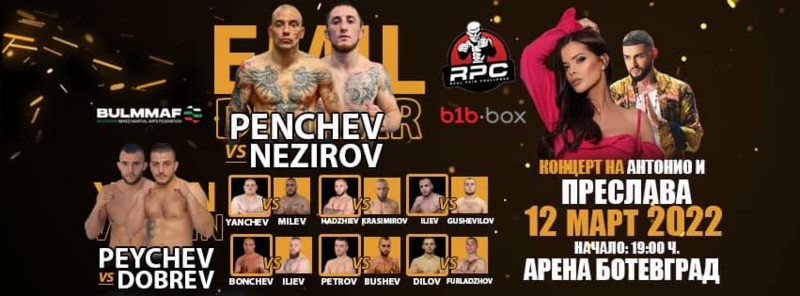 Главната среща на RPC: Ботевград е очаквана с интерес. В нея един срещу друг ще се изправят шампиона по кикбокс, Димитър Пенчев срещу шампиона по бойно самбо, Емил Незиров. Сблъсъкът между стиловете в ММА правилник се очертава да бъде доста атрактивен.