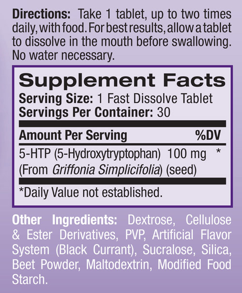 5-HTP Fast Dissolve на Natrol по естествен път подобрява настроението, чрез вкусни таблетки с аромат на горски плодове. 5-HTP не съдържа синтетични съставки и е източник на аминокиселина на растителна основа, която по натурален начин повишава нивото на серотонин - химическият вестител, който влияе на емоциите, поведението, апетита, мисълта и съня.