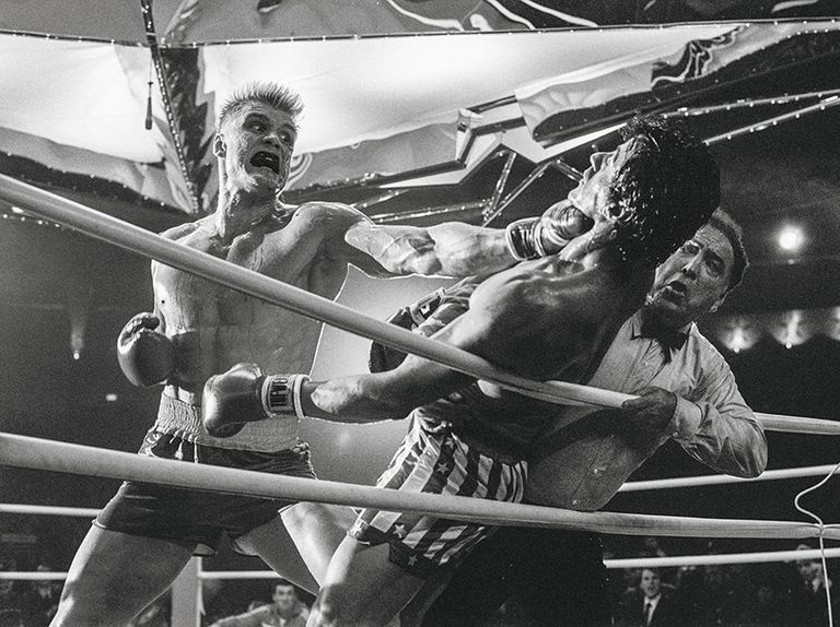 По време на тази сцена от Rocky IV, руснакът Ivan Drago (Dolph Lundgren) просто издивява срещу Rocky (Sylvester Stallone). Коментаторът междувременно крещи: