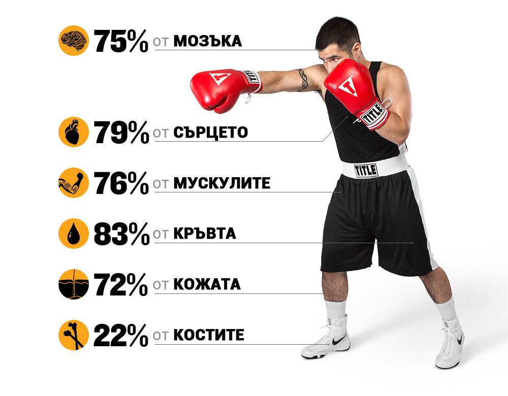 75% от мозъка - доказано е, че при наличието на малко вода, мозъчните контузии при контактните спортове могат да се увеличат. Мозъкът е съставен от около 100 милиарда нервни клетки. Те понасят ударите по-добре, когато клетките са пълни с вода и здрави.