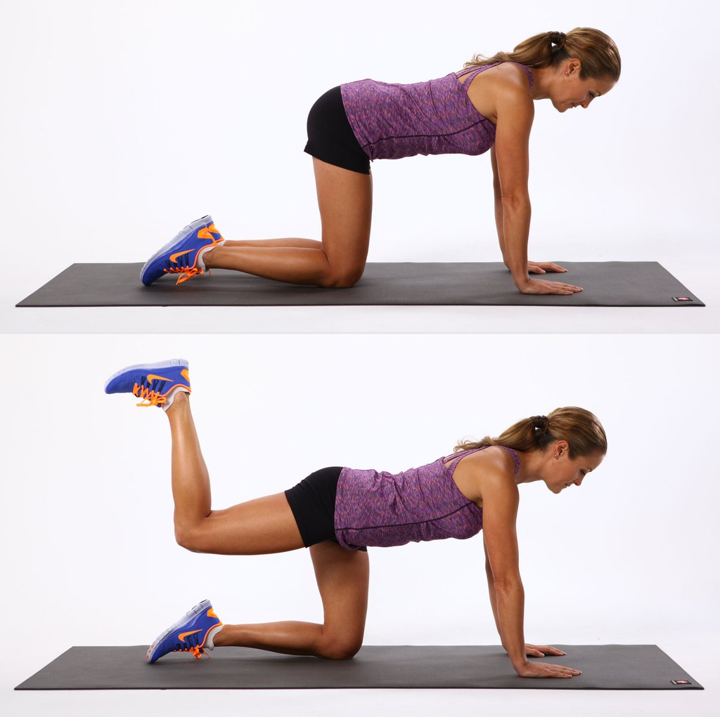 Застани на ръце и крака, стягайки ядрото си. Гледай към земята и стегни десния си крак. Придържайки коляното сгънато, включи в действие глутеусите и повдигни крака, изпъвайки петата към небето. Върни крака в изходна позиция плавно и повтори.